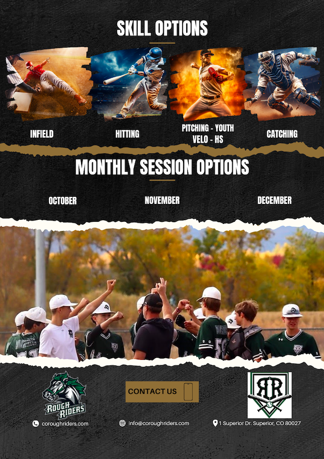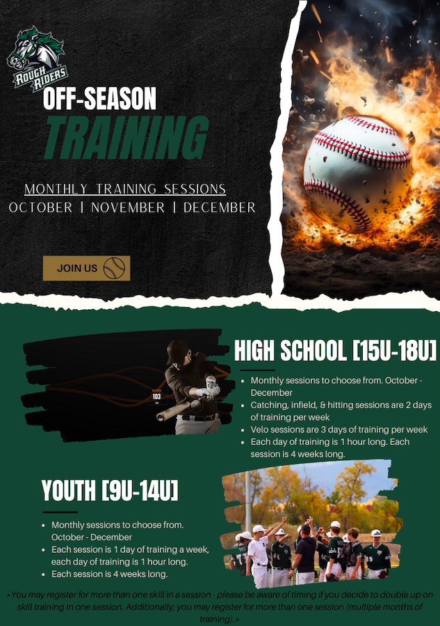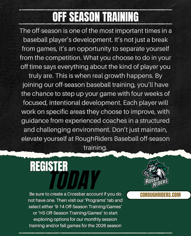 Register here for your 4 week off-season training session! 1 day per week to develop your chosen skill: Hitting, Pitching, Catching, or Infield.